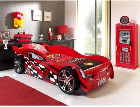 Dit te gekke rode autobed van Vipack heeft een matchende pump kledingkast om de slaapkamer geheel in de racestijl te krijgen.